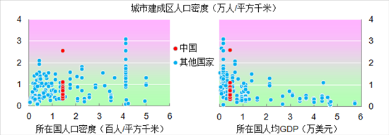 城市擁擠度(建成區(qū)人口密度)與所在國(guó)人口密度和人均GDP的關(guān)系