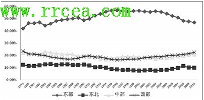 1979年-2010年中國四大區(qū)域資本形成總額占全國比重變化