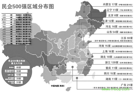 由全國工商聯(lián)發(fā)布的“2013中國民企500強”日前揭曉,統(tǒng)計發(fā)現(xiàn),500強企業(yè)中307家集中在浙江、江蘇、山東、廣東4個東部沿海省份,占500強總數(shù)超六成。