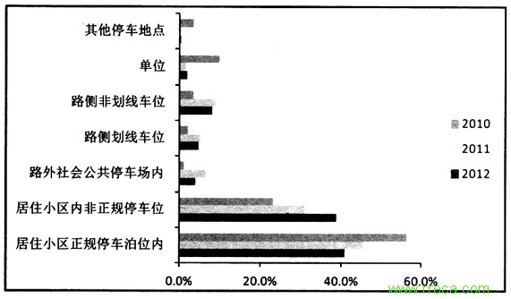 停車空間作為重要的城市靜態(tài)交通空間,整個(gè)城市交通系統(tǒng)的重要節(jié)點(diǎn),而大部分城市的停車空間管理滯后。尤其在大都市中心城區(qū),大量老舊小區(qū)建設(shè)時(shí)并未配備充足的停車位,甚至沒有規(guī)范的停車位,隨著機(jī)動(dòng)車數(shù)量的快速增長,停車位不足的問題更加突出。一些新建小區(qū)居住密度較高,由于內(nèi)部空地有限,地下停車位也難以滿足全部居民的停車需求。還有部分居民為了節(jié)省停車位租金,或者不愿購買開發(fā)商出售的車位,而長期將車輛停在小區(qū)內(nèi)外的非正規(guī)車位上。以上因素共同作用下,城市道路上的非正規(guī)停車現(xiàn)象比較常見,甚至擠占大量道路空間,更會(huì)加劇城市道路(尤其是支路)上的交通擁堵。如圖2所示,2012年,北京市的備案停車位僅161萬個(gè),不及機(jī)動(dòng)車數(shù)量的1/3;夜間停車統(tǒng)計(jì)中,將車輛停在小區(qū)、單位或公共停車場等正規(guī)停車位內(nèi)的車輛僅占47.2%,有39.1%的車輛停放在小區(qū)內(nèi)非正規(guī)停車位,有13.2%的車輛停放在路側(cè);白天機(jī)動(dòng)車開出小區(qū)后,大量停靠在路側(cè)的劃線或未劃線停車位上。