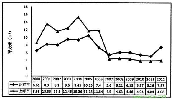 圖1 2000年以來北京、上海人均城市道路面積變化圖