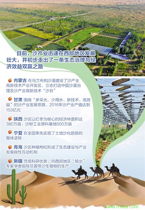 發(fā)端于甘肅、成長于內蒙古的沙產業(yè),迅速在西部地區(qū)發(fā)展壯大,并初步走出了一條生態(tài)治理與經濟效益雙贏之路。內蒙古在烏蘭布和沙漠建設了沙產業(yè)高新技術產業(yè)開發(fā)區(qū),立志打造中國沙漠治理及沙產業(yè)高新技術“沙谷”。甘肅圍繞“多采光、少用水、新技術、高效益”的沙產業(yè)發(fā)展思路,2016年沙產業(yè)產值達到153億元;陜西沙區(qū)以紅棗為核心的經濟林面積達380萬畝,沙柳工業(yè)原料基地500萬畝;寧夏在全國率先實現(xiàn)了土地沙化趨勢的整體逆轉,青海沙區(qū)種植枸杞形成了生態(tài)建設與產業(yè)發(fā)展良性互動機制;新疆憑借科研優(yōu)勢,向西部地區(qū)“輸出”專家學者指導蓯蓉等沙生植物的生產。