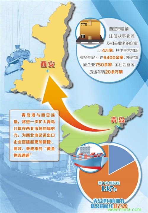 西安大力發(fā)展“樞紐經(jīng)濟(jì)、門(mén)戶經(jīng)濟(jì)、流動(dòng)經(jīng)濟(jì)”,打造“一帶一路”國(guó)際物流樞紐和建設(shè)國(guó)家現(xiàn)代物流創(chuàng)新發(fā)展示范城市,青島正從港口向樞紐港、貿(mào)易港轉(zhuǎn)型。一條鐵路班列線將青島與西安兩座城市的海港與陸港相連,建立起了陸海鐵多式聯(lián)運(yùn)通道