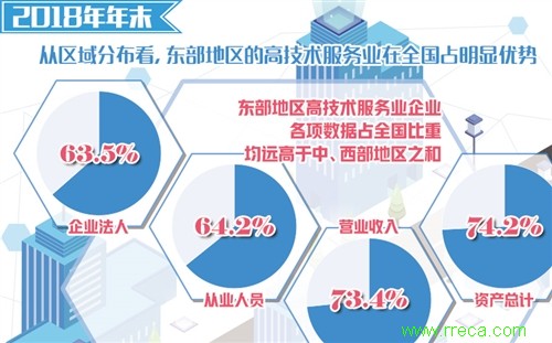 從區(qū)域分布看,東部地區(qū)的高技術(shù)服務(wù)業(yè)在全國占明顯優(yōu)勢。2018年年末,東部地區(qū)高技術(shù)服務(wù)業(yè)企業(yè)法人單位數(shù)、從業(yè)人員、營業(yè)收入、資產(chǎn)總計分別占全國高技術(shù)服務(wù)業(yè)企業(yè)法人單位的63.5%、64.2%、73.4%和74.2%,均遠(yuǎn)高于中、西部地區(qū)之和。