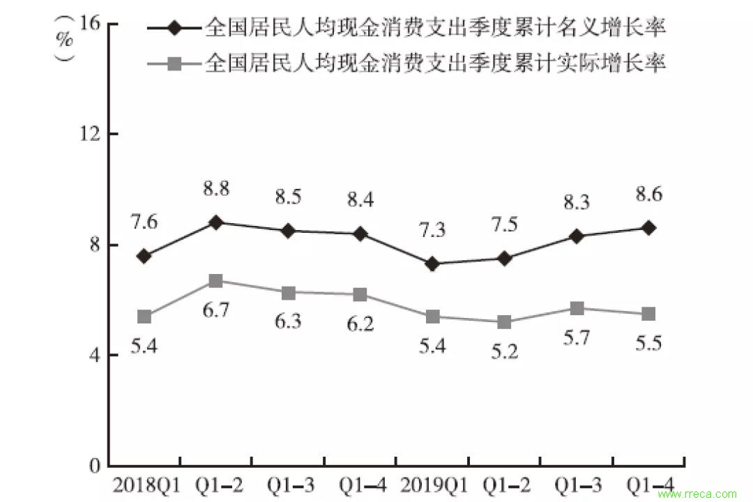 圖1 2018-2019年全國居民人均現(xiàn)金消費(fèi)支出季度累計(jì)名義和實(shí)際增長(zhǎng)率(%)