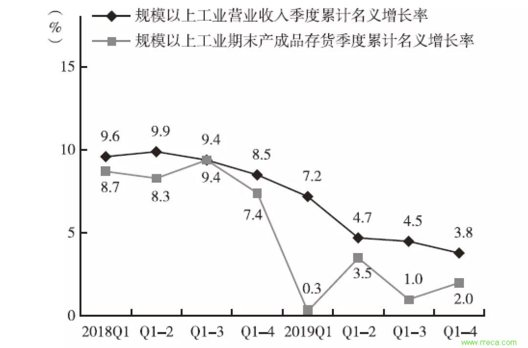 圖3 2018-2019年規(guī)模以上工業(yè)營(yíng)業(yè)收入和期末產(chǎn)成品存貨季度累計(jì)名義增長(zhǎng)率