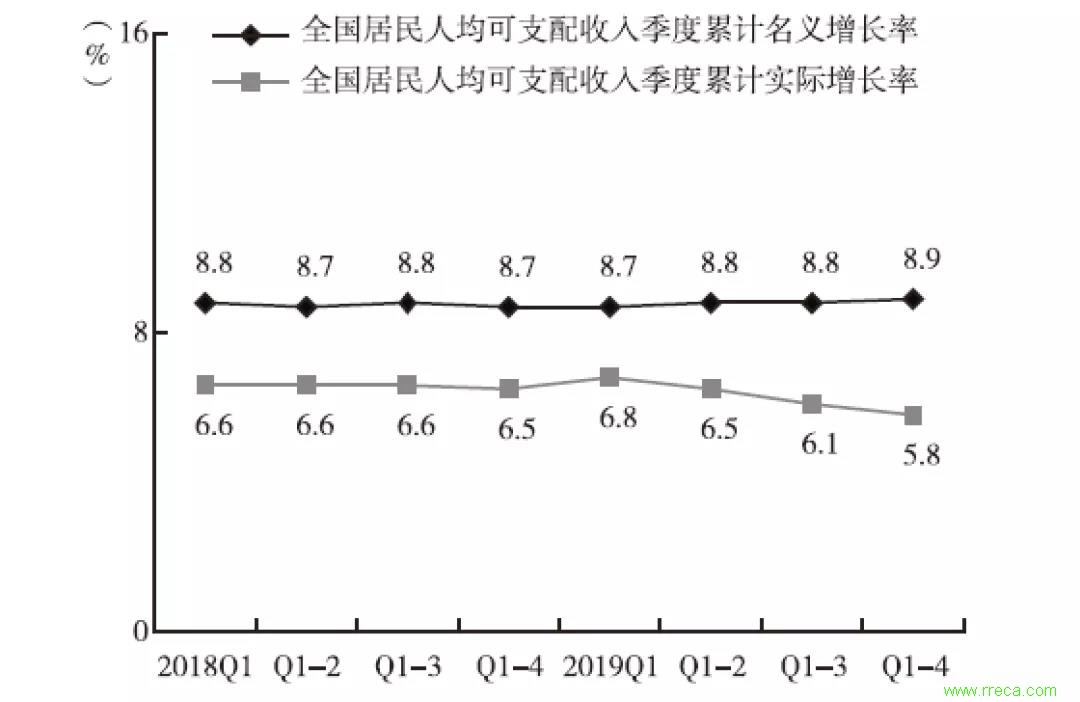 圖4 2018-2019年全國居民人均可支配收入季度累計(jì)名義和實(shí)際增長(zhǎng)率