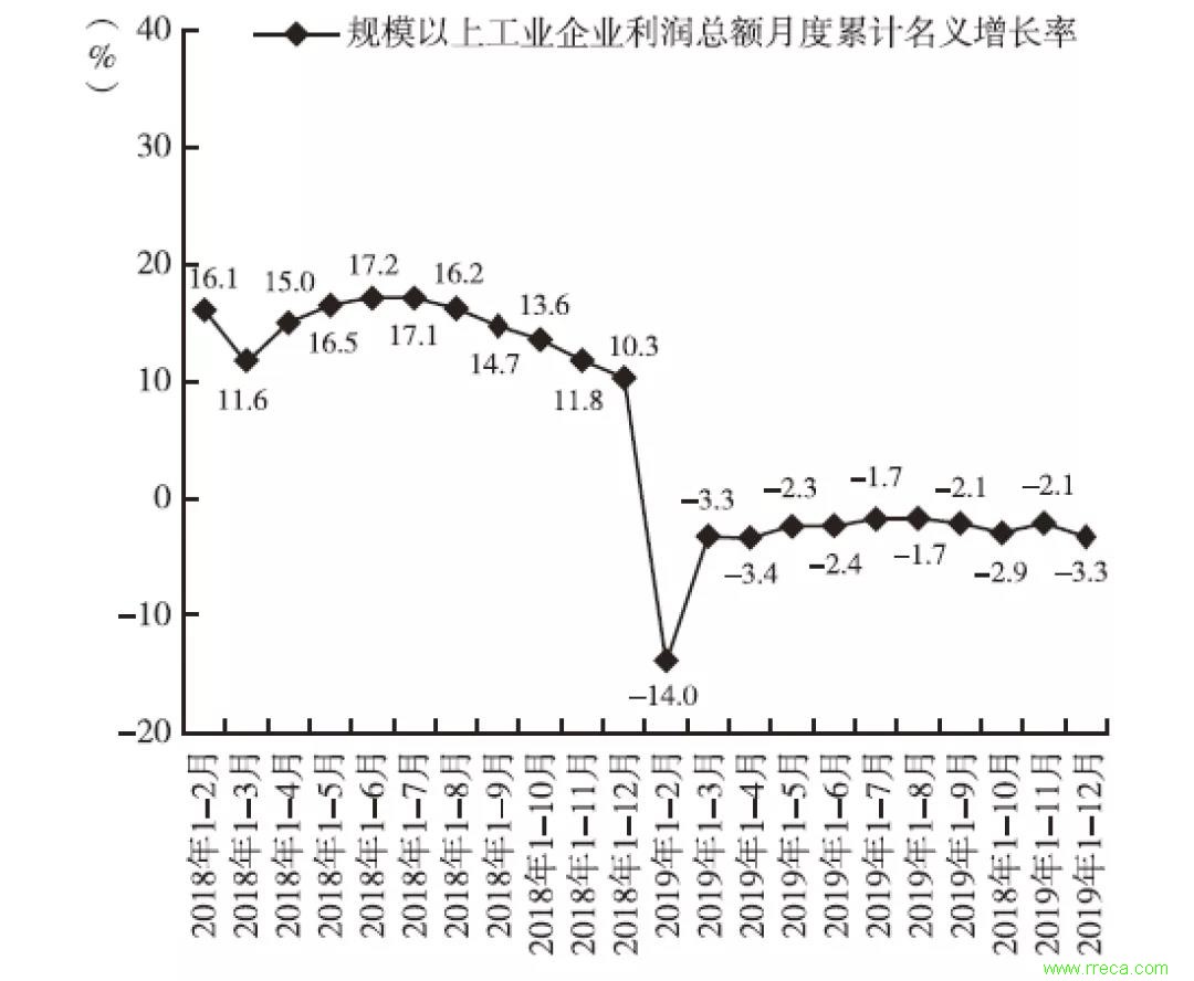 圖5 2018-2019年規(guī)模以上工業(yè)企業(yè)利潤(rùn)總額月度累計(jì)名義增長(zhǎng)率