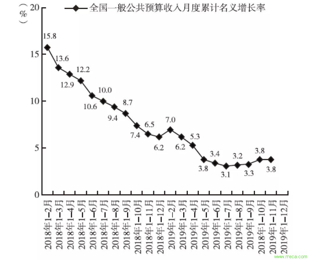 圖6 2018-2019年全國一般公共預(yù)算收入月度累計(jì)名義增長(zhǎng)率