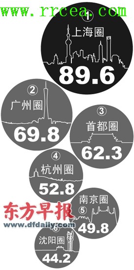 2012年中國(guó)18大都市圈綜合競(jìng)爭(zhēng)力排名前六位的都市圈。