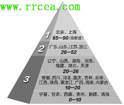 研究結(jié)果顯示,北京、上海位于“第一梯隊”,指數(shù)值在85-90之間,且兩地指數(shù)差異較小。第二梯隊集中了廣東、山東、江蘇和浙江四省,指數(shù)值介于52-26之間。第三梯隊分布著25個省區(qū)市,指數(shù)值低于26。其中,遼寧、山西、湖南、河南、福建、湖北和天津相對領(lǐng)先。