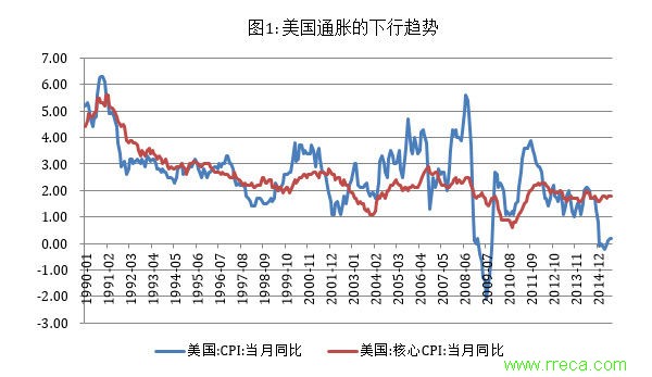 根據(jù)國會授權(quán),美聯(lián)儲有兩大職能:一是充分就業(yè),二是物價穩(wěn)定。先來看物價(圖1)。美國核心通脹這幾年一直在2%的長期目標(biāo)以下徘徊,現(xiàn)在保持在1.8%的低位。而且,由于石油價格的下滑,扣除石油和食品的非核心通脹更低,現(xiàn)在只有0.2%。倘若石油價格進(jìn)一步下滑,通脹下行的壓力依然存在。更重要的是,1990年代以來,美國的通脹水平在波動中下行,趨勢延續(xù)的話,應(yīng)該繼續(xù)下行,至少看不到上行的壓力。
