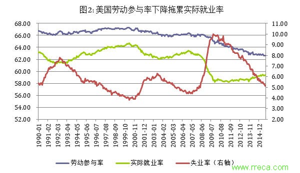 失業(yè)率這幾年雖然在降低,從2009年10月的10%下降到現(xiàn)在的5.1%,但是勞動參與率一直在下降(圖2)。這樣,考慮到勞動參與率之后的實際就業(yè)率,也就是就業(yè)人口占適齡勞動人口的比重,只有輕微的復(fù)蘇,現(xiàn)在依然只有59.5%左右,遠(yuǎn)遠(yuǎn)低于1990年代以來的62-64%的波動區(qū)間。