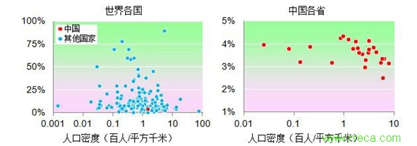 圖1是人口密度與失業(yè)率的關系。左邊為世界166個國家和地區(qū)(其余無數(shù)據);右邊為中國除直轄市以外的27個省區(qū)。中國的數(shù)據是城鎮(zhèn)失業(yè)率,未必真實反映整體失業(yè)狀況。該圖顯示,人口密度越大的地區(qū)失業(yè)率傾向更低,但關系不是很顯著。該圖表明人口對就業(yè)的影響基本是中性,略偏正面。過去30年,中國人口不斷從人少向人多的地方遷徙,從內陸到沿海,從鄉(xiāng)村到城市,從小城市到大城市。如果人口少有利于就業(yè),那么人口應該朝相反的方向遷徙。