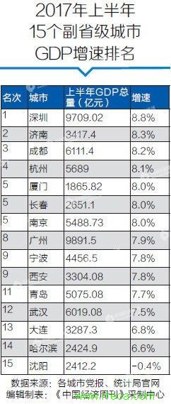 15個副省級城市中,上半年經濟增速從高到低分別為深圳、濟南、成都、杭州、廈門、長春、南京、廣州、寧波、西安、青島、武漢、大連、哈爾濱、沈陽,其中,深圳增速最高為8.8%,濟南以8.3%的增速排名第二,成都和杭州分別以8.2%、8.1%緊隨其后,廈門、長春、南京均為8.0%。這7個城市上半年經濟增速都保持了“8”的水平。