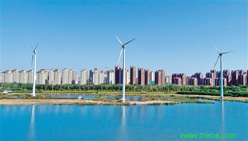 矗立在中新天津生態(tài)城河邊的風(fēng)力發(fā)電車。 新華社記者 岳月偉攝