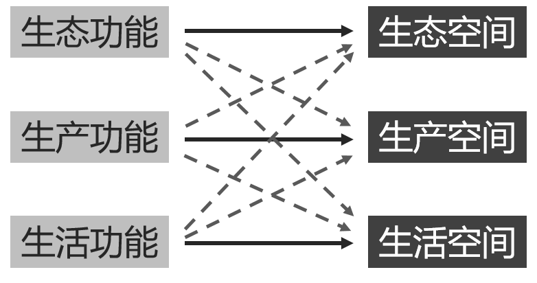 由此可見(jiàn),“三生空間”的功能具有復(fù)合性,“空間”與“功能”之間存在“多對(duì)多”的復(fù)雜關(guān)系,即一類(lèi)空間包含多種功能。在多種功能中又存在主導(dǎo)功能(圖2),例如生態(tài)空間中以生態(tài)功能為主導(dǎo),同時(shí)存在著生產(chǎn)與生活的其余附加職能。這種同一功能分布在不同空間,同一空間對(duì)應(yīng)著多種功能的多對(duì)多關(guān)系,需要著重厘清。