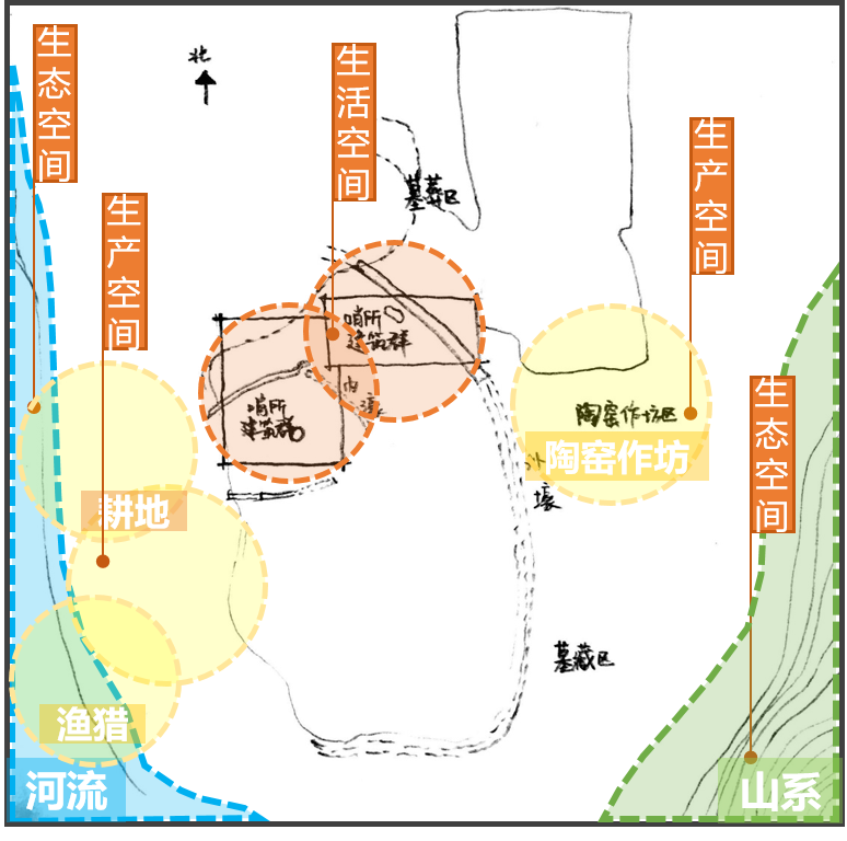 從中國(guó)傳統(tǒng)城市建設(shè)中我們可以挖掘出“三生空間”的特點(diǎn)、演化機(jī)制與內(nèi)在關(guān)系。我們的先輩為了生態(tài)安全、生活保障與穩(wěn)定的定居,非常重視“三生空間”的選擇與匹配關(guān)系。這種重視首先體現(xiàn)在歷史遺址中。在西安半坡村遺址(圖9)中,白鹿原可遮擋風(fēng)寒并提供林木,既是主要的生態(tài)功能空間,也是重要的生產(chǎn)空間;河流是生態(tài)空間,同時(shí)可提供農(nóng)耕用水與漁獵等生產(chǎn)功能;居住空間以壕溝為主,形成穴居群落外,還提供了制陶區(qū)與墓葬區(qū)。因此,半坡村生態(tài)生活生產(chǎn)三者兼顧,同時(shí)三者協(xié)同并互相利用。正是因?yàn)榘肫麓逍纬傻倪@種高度耦合的穩(wěn)態(tài)關(guān)系,使得人居環(huán)境能夠持續(xù)穩(wěn)態(tài)的發(fā)展。在姜寨遺址(圖10)中我們也能發(fā)現(xiàn)同樣的現(xiàn)象。這便是先輩的營(yíng)建智慧,揭示了“三生空間”三者之間的規(guī)律,對(duì)我們現(xiàn)在仍有非常大的啟示。